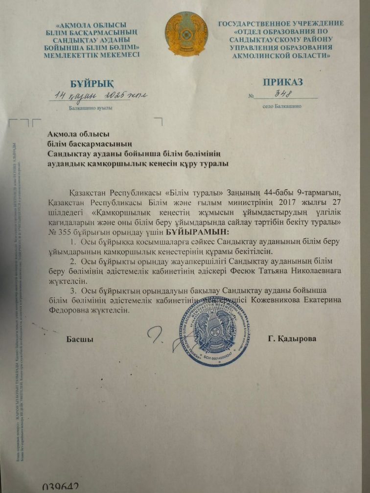 Ақмола облысы білім басқармасының Сандықтау ауданы бойынша білім бөлімінің аудандық қамқоршылық кеңесін құру туралы бұйрық
