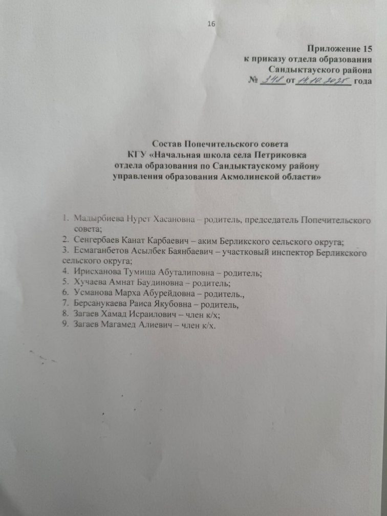 Приложение 15 к приказу отдела образования по Сандыктаускому району № 348 от 14.10.2025 "О составе Попечительского совета КГУ "Начальная школа села Петриковка отдела образования по Сандыктаускому району управления образования Акмолинской области"