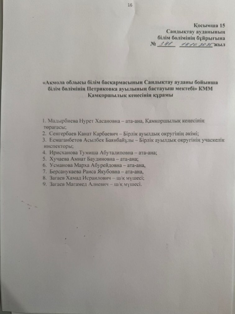 "Ақмола облысы білім басқармасының Сандықтау ауданы бойынша білім бөлімінің Петриковка ауылының бастауыш мектебі "КММ Қамқоршылық кеңесінің құрамы туралы"Сандықтау ауданы бойынша білім бөлімінің 14.10.2025 № 348 бұйрығына 15-қосымша